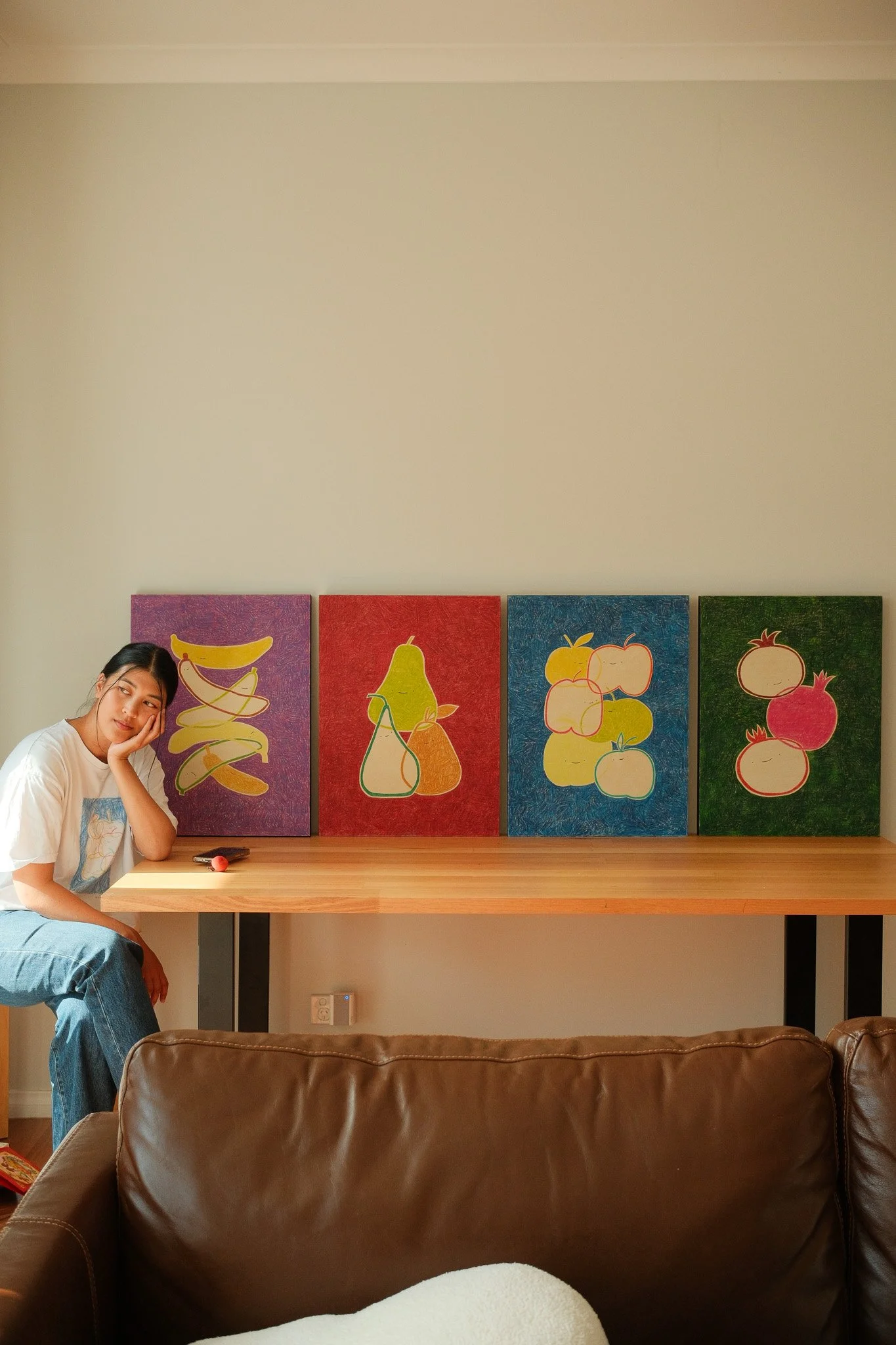 Limited Edition 1/1This first piece of the collection is my fourth iteration of this design. I love how the apples ven diagram over each other and weave colours through the drawing. The happy faces appear as if they are having joyful conversations with each other, something that I strive to emulate in my day to day - whether it’s a little joke or an outfit compliment.